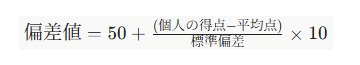 偏差値は「受験者集団(母集団)内での平均点(偏差値50)からの隔たり」を表し、上の式で計算されます。